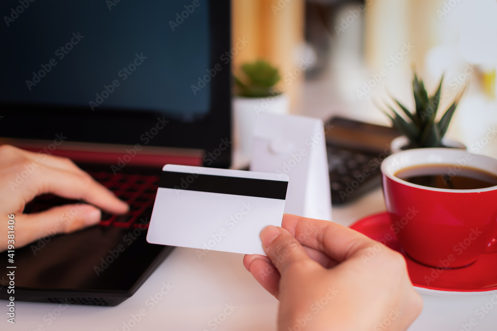 Online shopping concept. A young woman with a credit card in her hands at a table orders goods from an online store. Open laptop, red coffee mug, hands close-up. Home interior, blank map layout