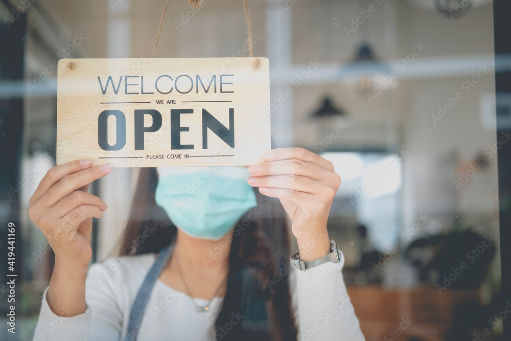 Young Asia girl wear face mask turning a sign from closed to open sign after lockdown.