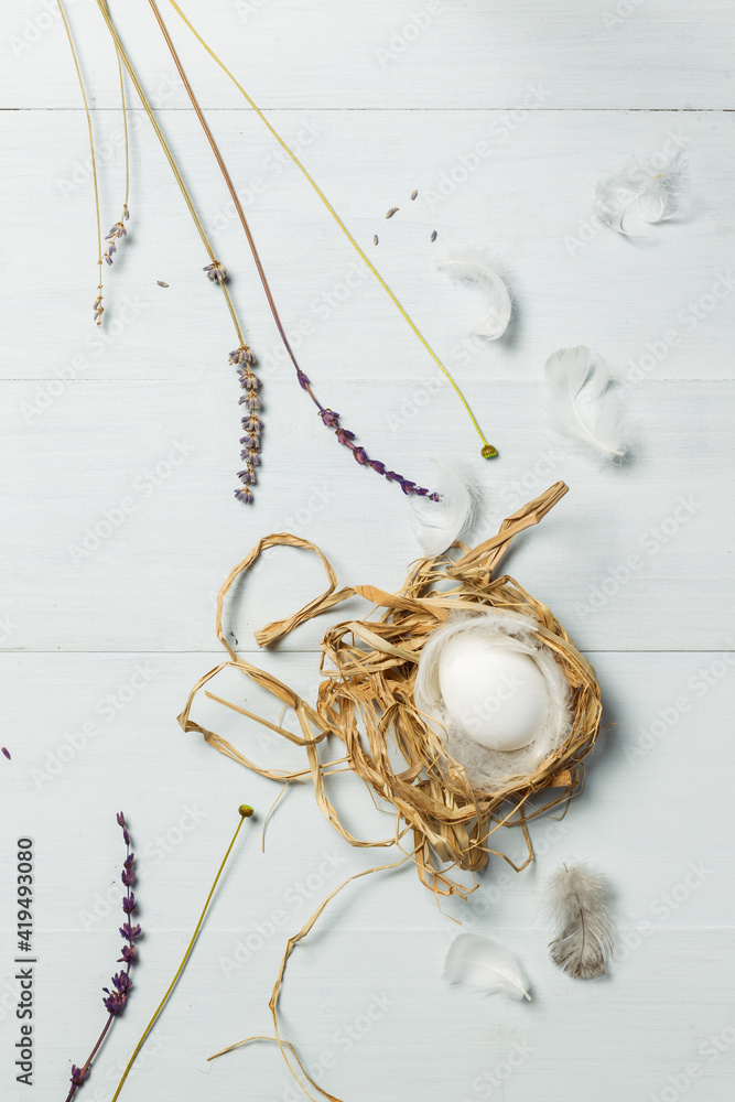An egg in a nest of straw and feathers. Top view on a light gray wooden background. Vertically with space