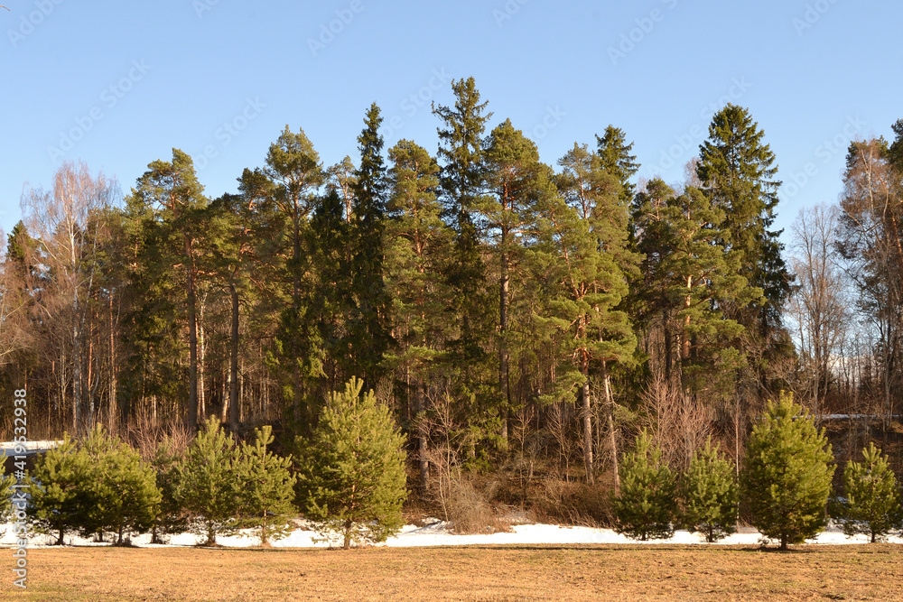 Spring in a pine forest of a park zone. In early spring, the snow melts in the forest, the grass turns green