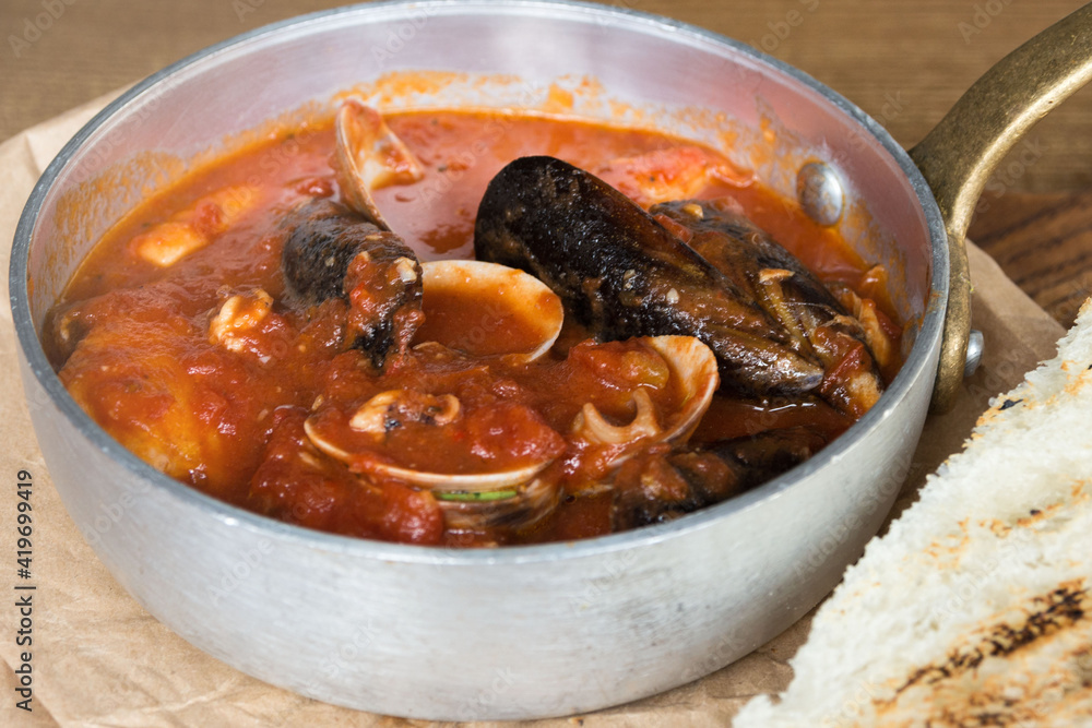 Delicious hearty lunch at a fish restaurant. Tuscan tomato soup with seafood Cacciucca. Cacciucco is a mixture of fish broth, red wine and tomato sauce.