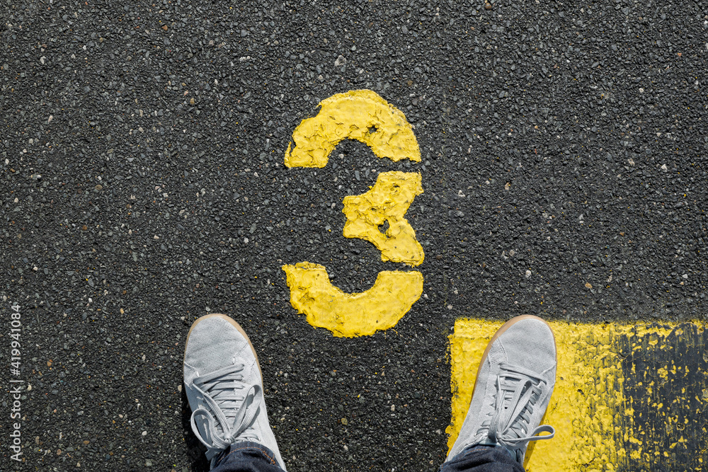 Men with grey sneker and jeans stand on the number 3, sign on the asphalt, yellow painted number and lines on dark street, space for text