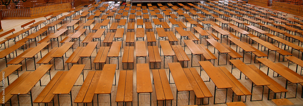 Leere Biertische auf einem Volksfest, Panorama