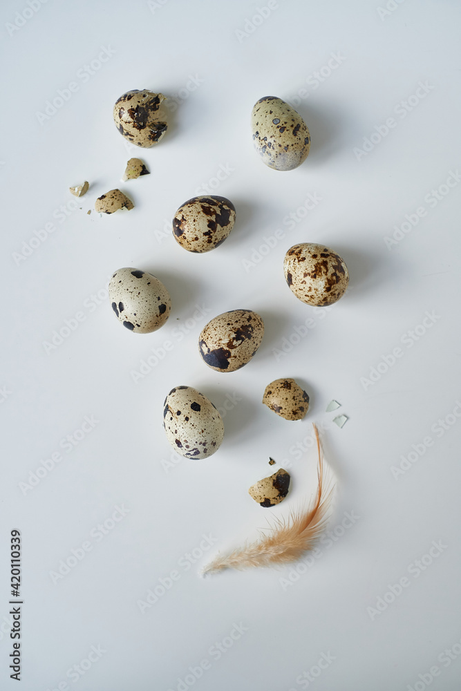 quail eggs with a feather on a white table. Easter concept Copy space