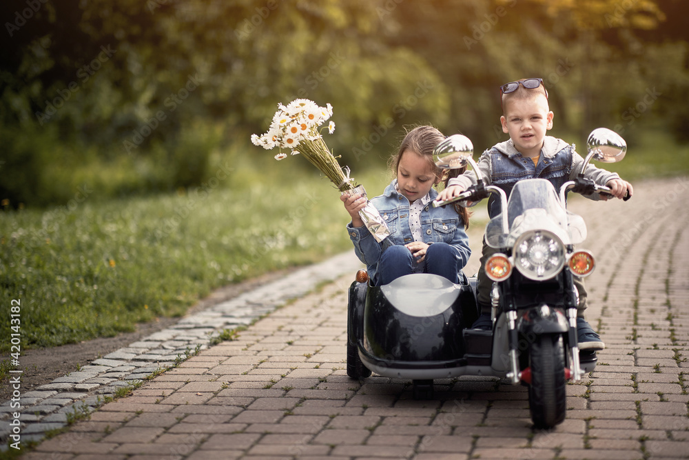 cute preschooler driving little girl in sidecar of motorcycle toy on battery in park