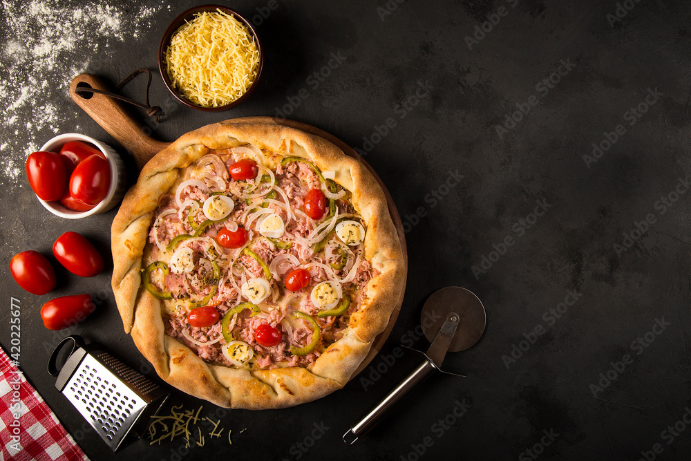Brazilian pizza. Top view of delicious Brazilian rustic pizza.