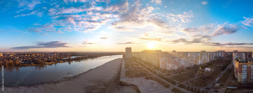 aerial, architecture, building, city, cityscape, downtown, evening, landscape, modern, river, street, sunset, urban, view