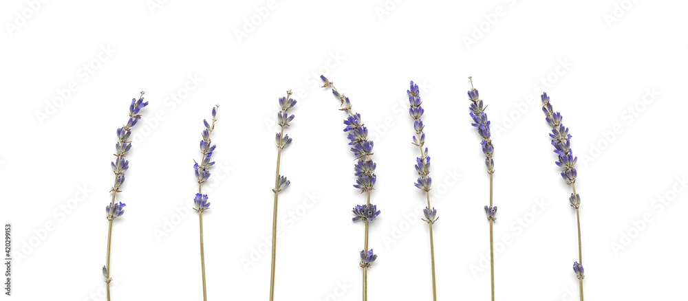 Composition of dried lavender flowers on a white background, banner. Top view, flat lay.