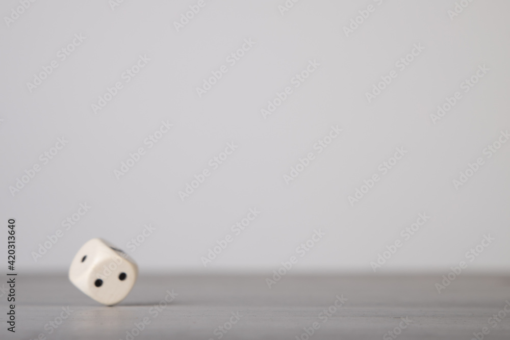 the die is cast, one white dice on a gray wooden board