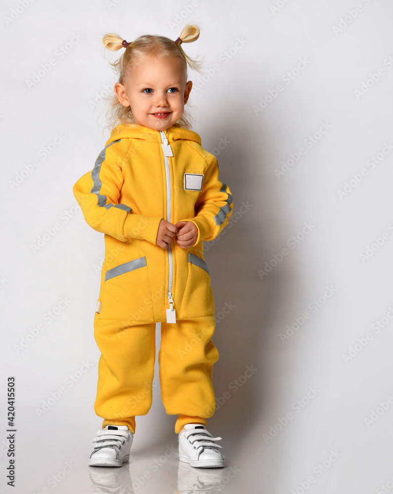 Little cute blonde girl in a warm comfortable overalls standing against a gray wall. Happy childhood and fashionable baby clothes