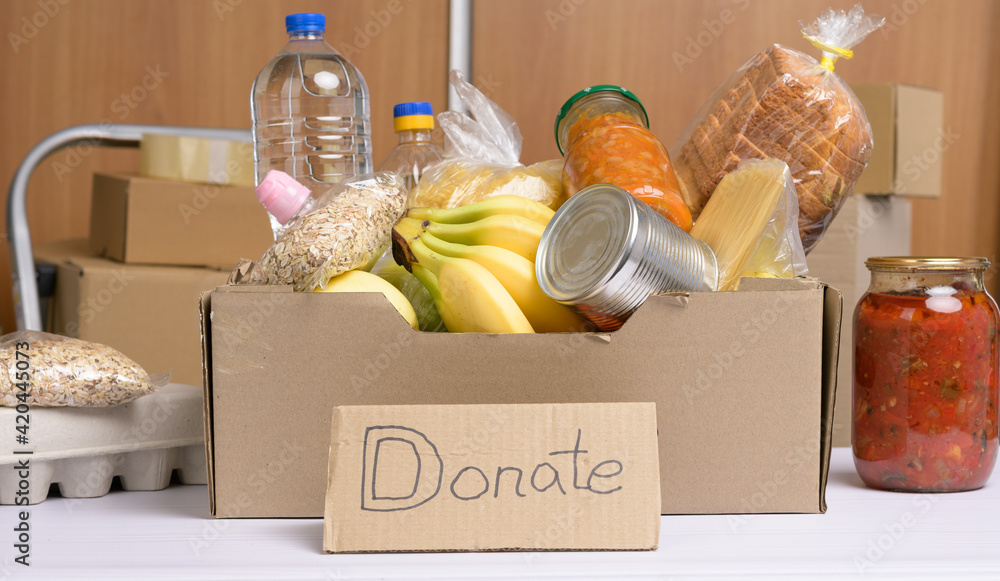 cardboard box with various products, fruits, pasta, sunflower oil in a plastic bottle and preservation