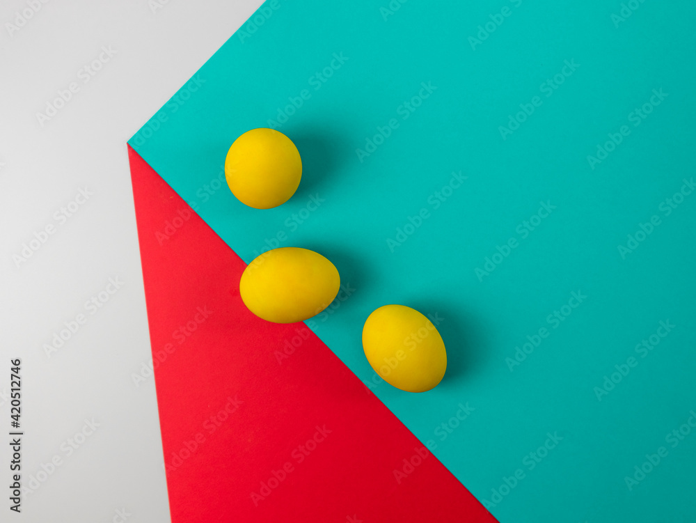 yellow eggs on a cube, easter eggs, optical illusion of a paper cube, copy space, easter card
