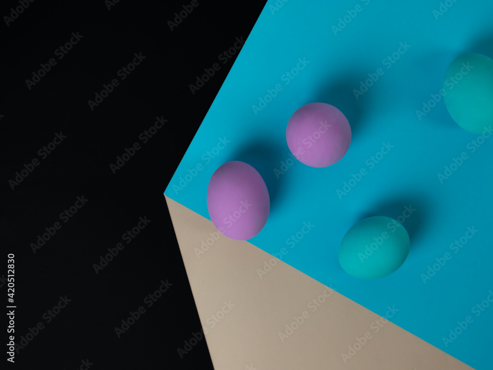 on a paper cube Easter eggs of pink and blue color, eggs in falling, optical illusion, Easter, concept, copy space