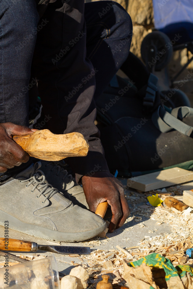 Carpenter craftsman with hands not recognizable holding a wooden mallet carving a wooden figure