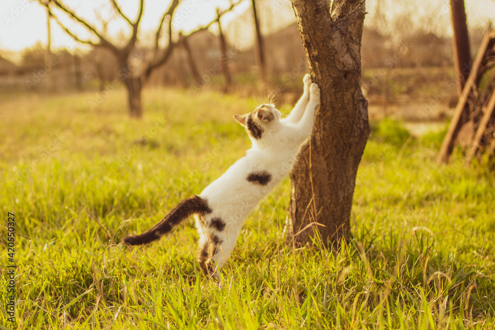 White spotted cat sharpens its claws on a tree in the sunny garden.
