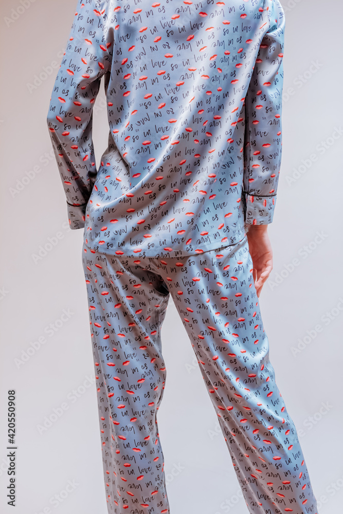 Beautiful sexy woman wearing a blue pajama. Fashion model on a beige background.