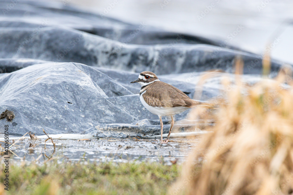 close up of a killdeer bird resting on the black tarp in the farm behind brown straws