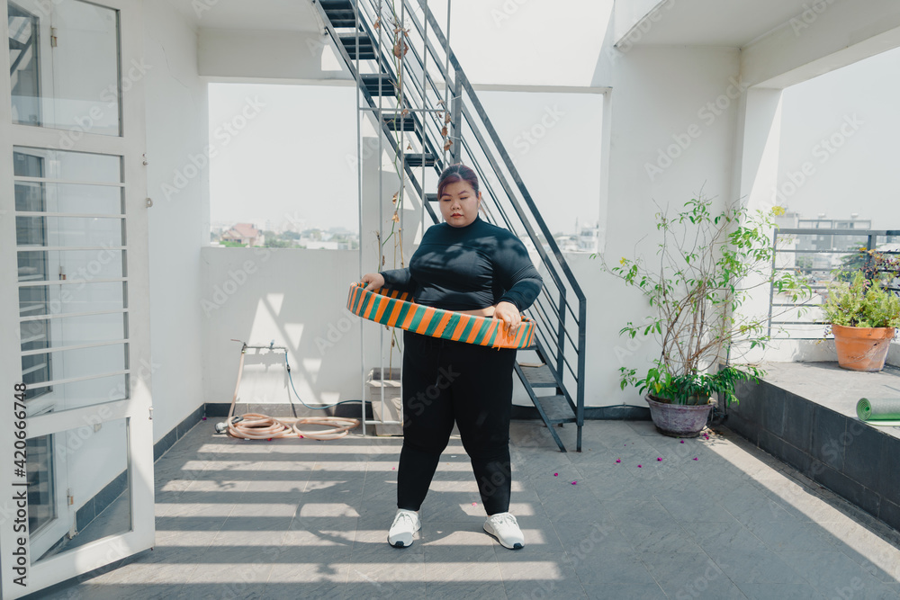 Plus size young asian woman playing hula hoop in balcony. Helps to burn excess fat in body. Strengthens the muscles of the body, going to loose extra pounds at home,