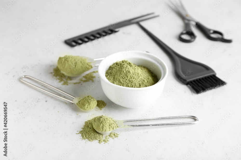 Bowl with henna, spoons and hairdresser's supplies on light background