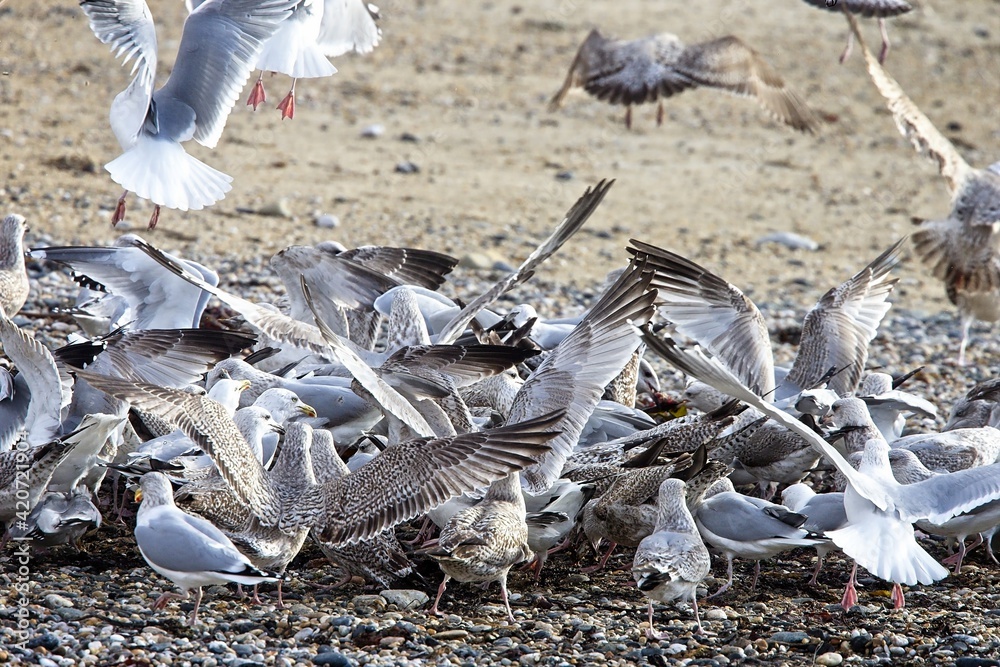 Herring Gulls (Larus argentatus) mixed age group feasting on beached shoal of fish, Marazion, Cornwall, England, UK.