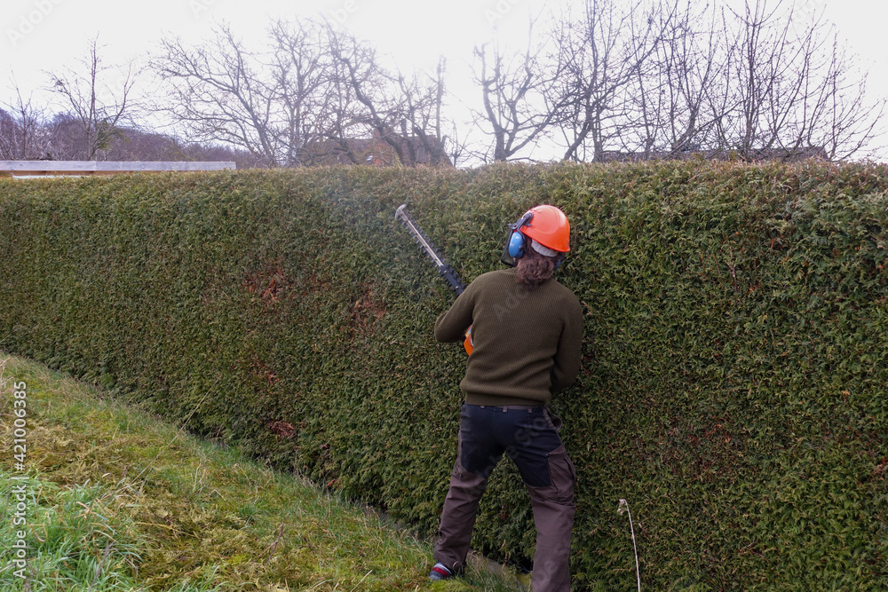 Gardener Topiary Job. Caucasian Men with Gasoline Hedge Trimmer Shaping Thuja in a Garden. Agriculture Theme.