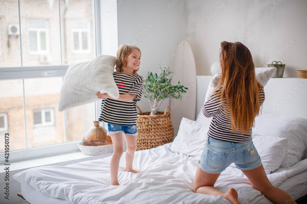 Happy young mother with her little girl at home playing on the bed with pillows, short brunette hair, the same clothes, striped T-shirts.