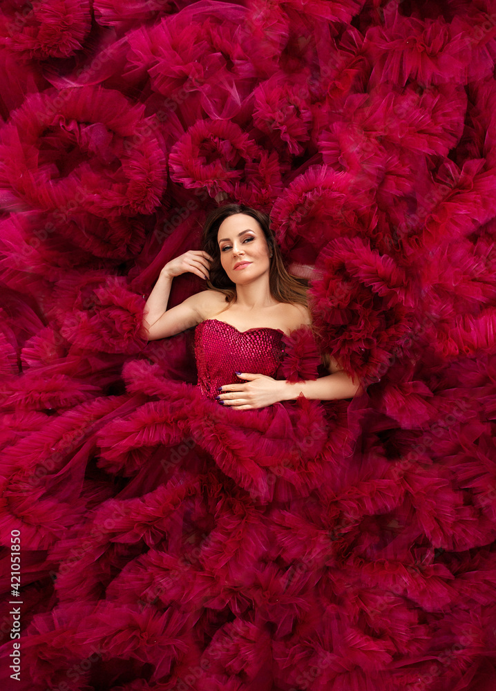 A beautiful young girl with long wavy hair lies on a burgundy dress-cloud looks at me, top view