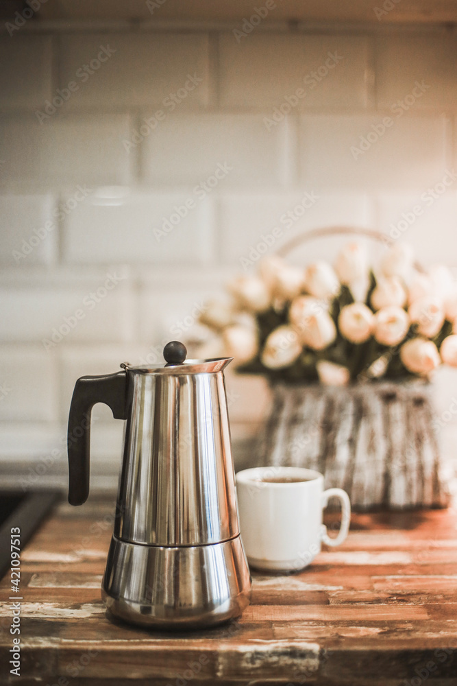 COFFEE MAKER FOR THE STOVE WITH A CUP OF COFFEE