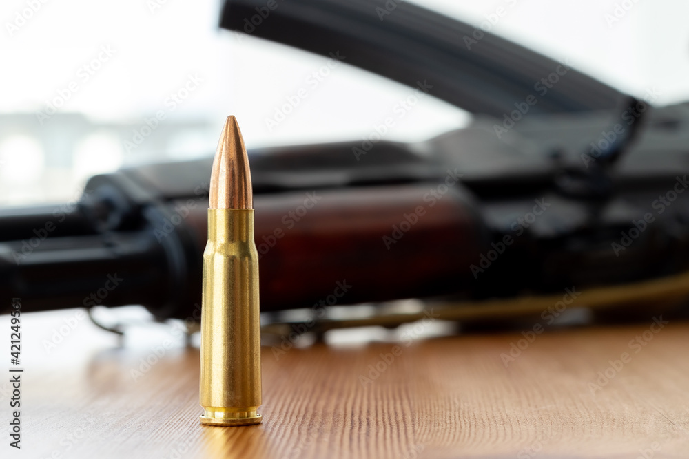 One bullet against blurred Kalashnikov assault rifle background. Cartridge 7.62 caliber for ak 47 closeup
