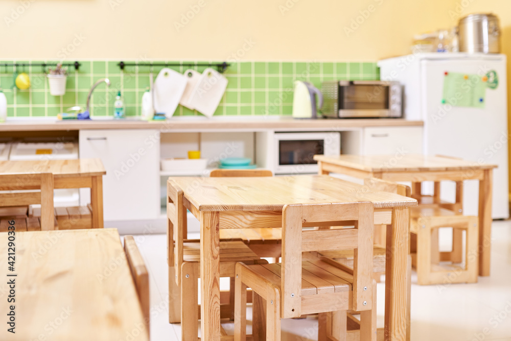 Light modern kitchen in Montessori kindergarten. wooden children's table with chairs in the foreground. nobody