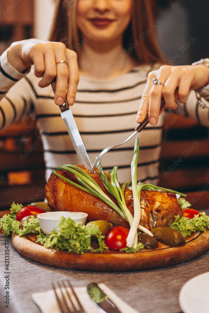 attractive woman with a fork and a knife cuts a large portion of fried meat at a table in a restaurant
