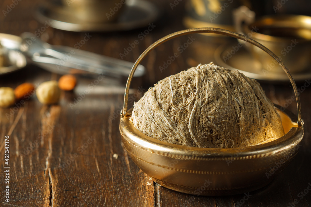 Oriental sweetness, airy halva, sweetness made of nuts and seeds in a copper vase. Close-up on a dark wooden background. Selective Focus