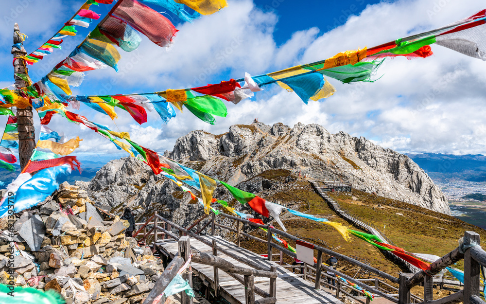 Shika snow mountain summit and Tibetan Buddhist prayer flags view Shangri-La Yunnan China