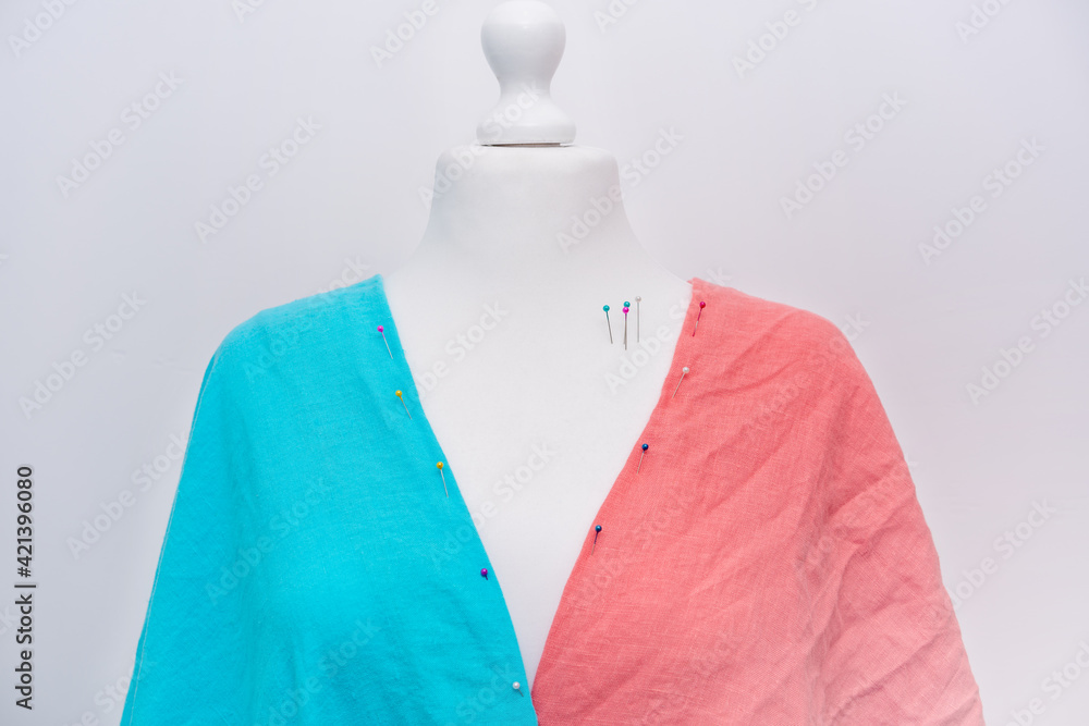 The use of tailor pins on the mannequin. The process of making handmade clothes. Unfinished raw material.