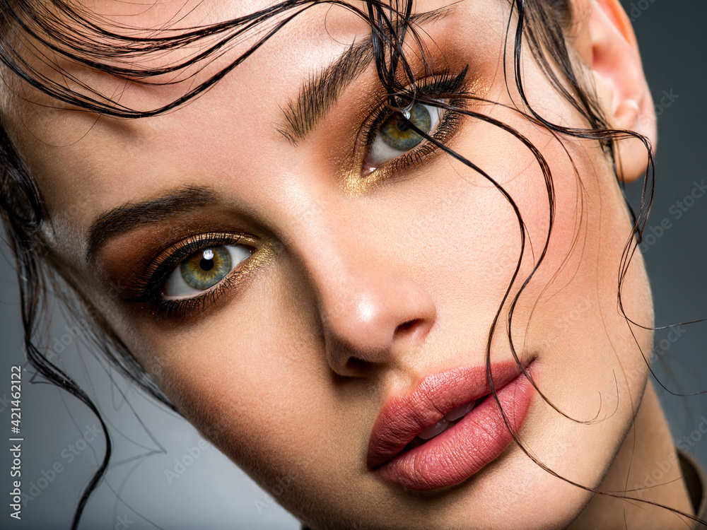 Closeup portrait of a beautiful young woman with brown gkamour makeup. Model looking at camera..