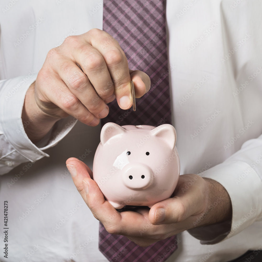 Office worker in a white shirt and tie, puts a coin in a piggy bank. Concept on the topic of personal development