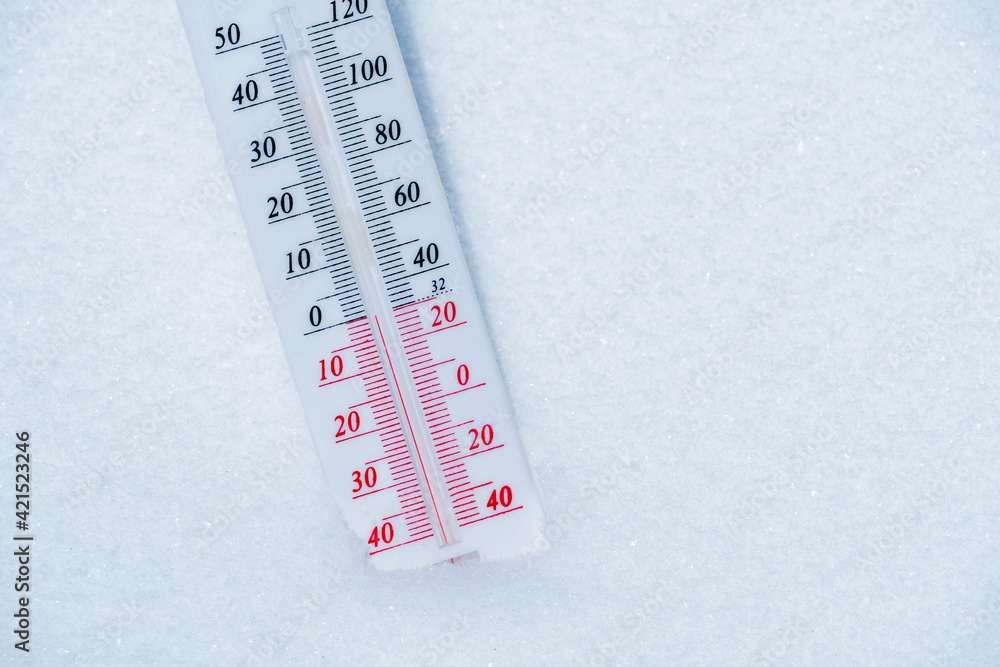 The thermometer lies on the snow and shows a negative temperature in cold weather on the blue sky.Meteorological conditions with low air and ambient temperatures.Climate change and global warming