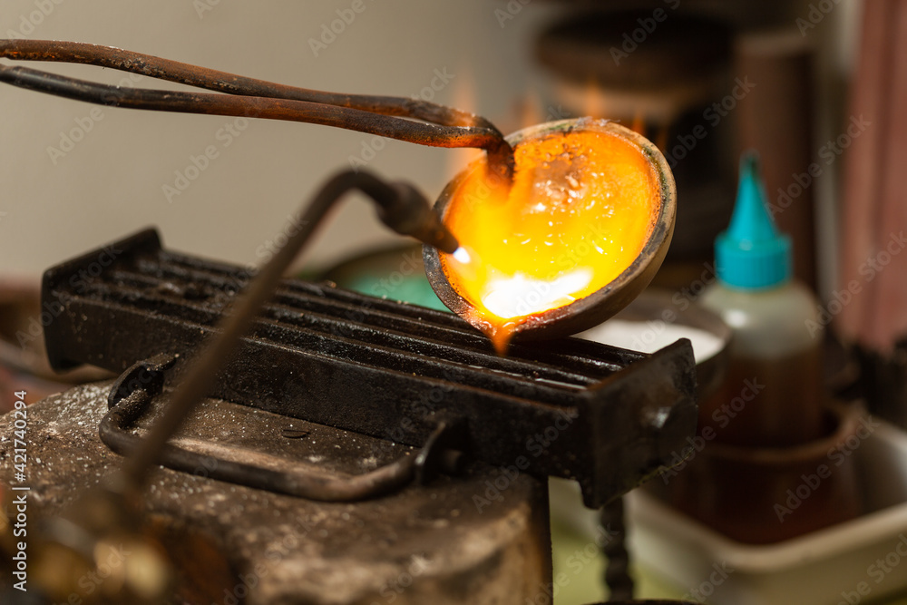 melting with blow torch and foundry of liquid silver from a bowl into a mold