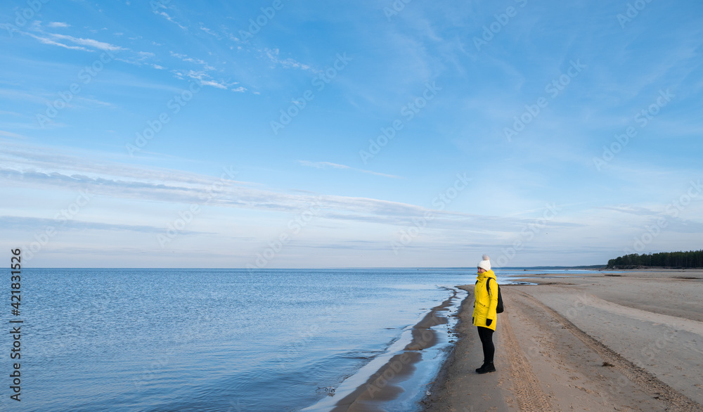 A woman in a yellow winter jacket and with a black backpack walking by the shores of the Baltic Sea near Carnikava, Latvia