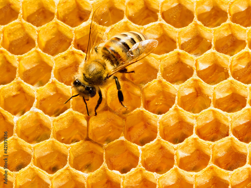 Close up view of the working bees on honeycells.