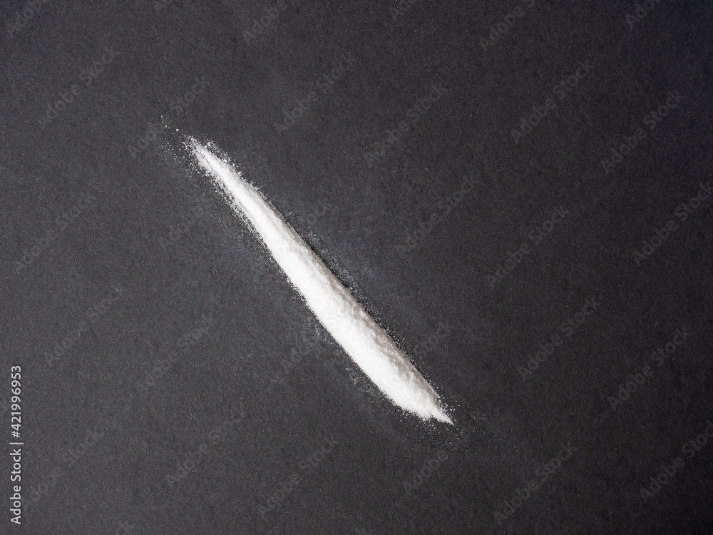 a white line of powder on a black background. The concept of prohibited substances, drugs, deadly substances, addiction