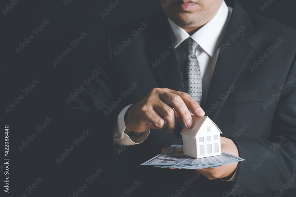 Business holding banknotes and paper house. Real estate investment concept