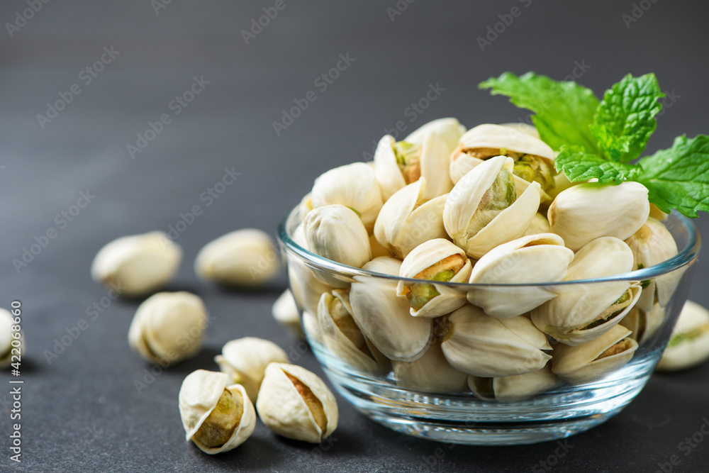 pistachios with mint leaf in glass cup on black table background.