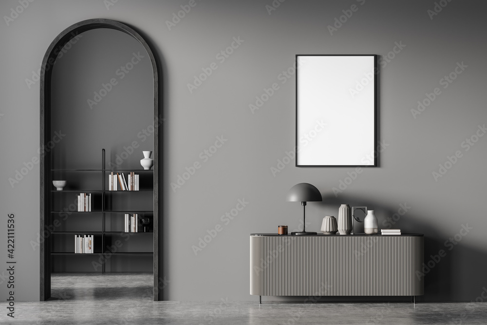 Modern dark colors living room interior with arch and blank framed poster on grey wall. Chest of drawers and bookshelf with books. concrete floor.
