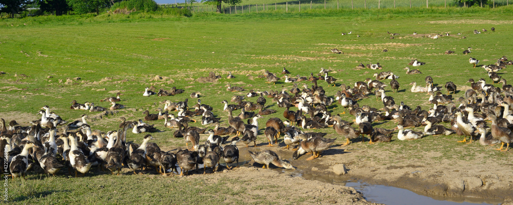 Panoramique élevage de canards à foie gras du Périgord, département de Dordogne en région Nouvelle-Aquitaine