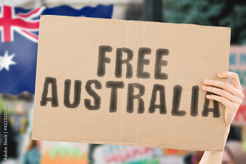The phrase " Free Australia " on a banner in men's hand with blurred Australian flag on the background. Protest. Riot. Violence. Economic crisis. Collapse. Politics. Streets. Save. Cruelty