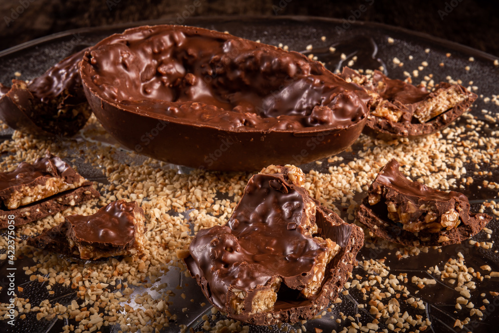 Stuffed chocolate easter egg with peanut and caramel on a wooden table with lots of peanuts around.