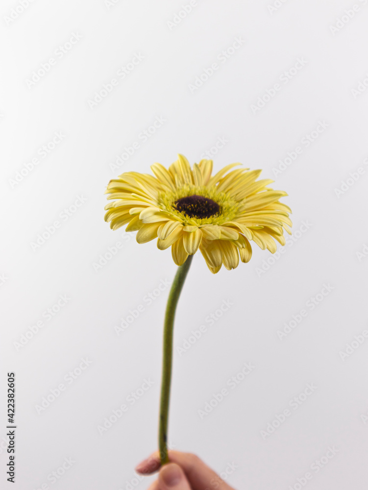 female hand holding a gerbera flower, spring flowers, yellow gerbera, blank for a postcard, copy space