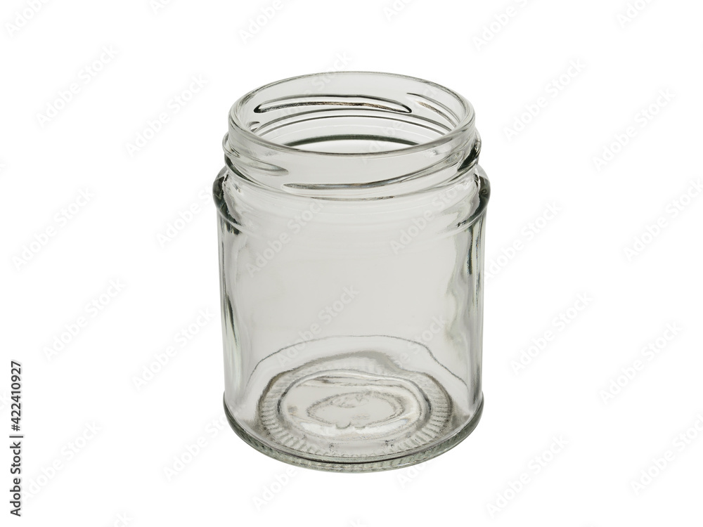 Empty glass jar, without a lid. Designed for food and food products, canned food and liquid beverages. Isolated on a white background, perspective view