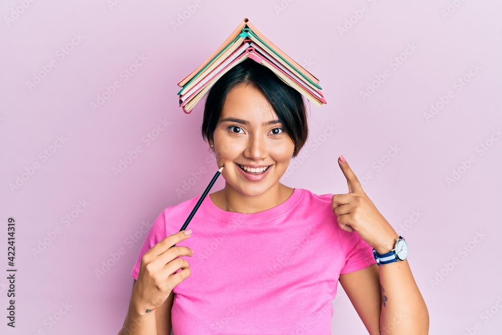 Beautiful young woman with short hair holding book over head smiling happy pointing with hand and finger